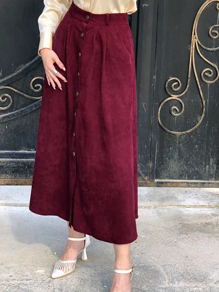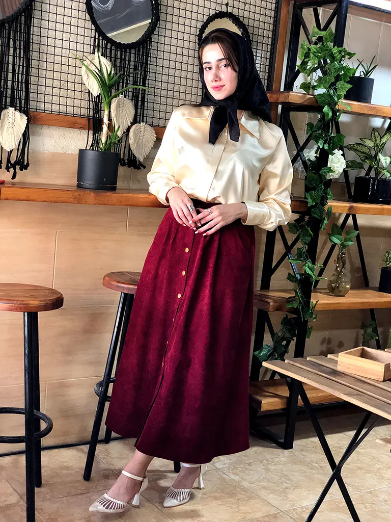 دامن زنانه پیلی دار جلو دکمه طرح مریم جنس مخمل کبریتی